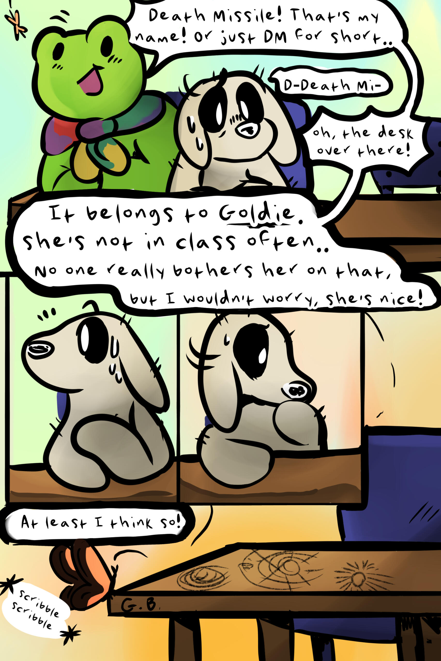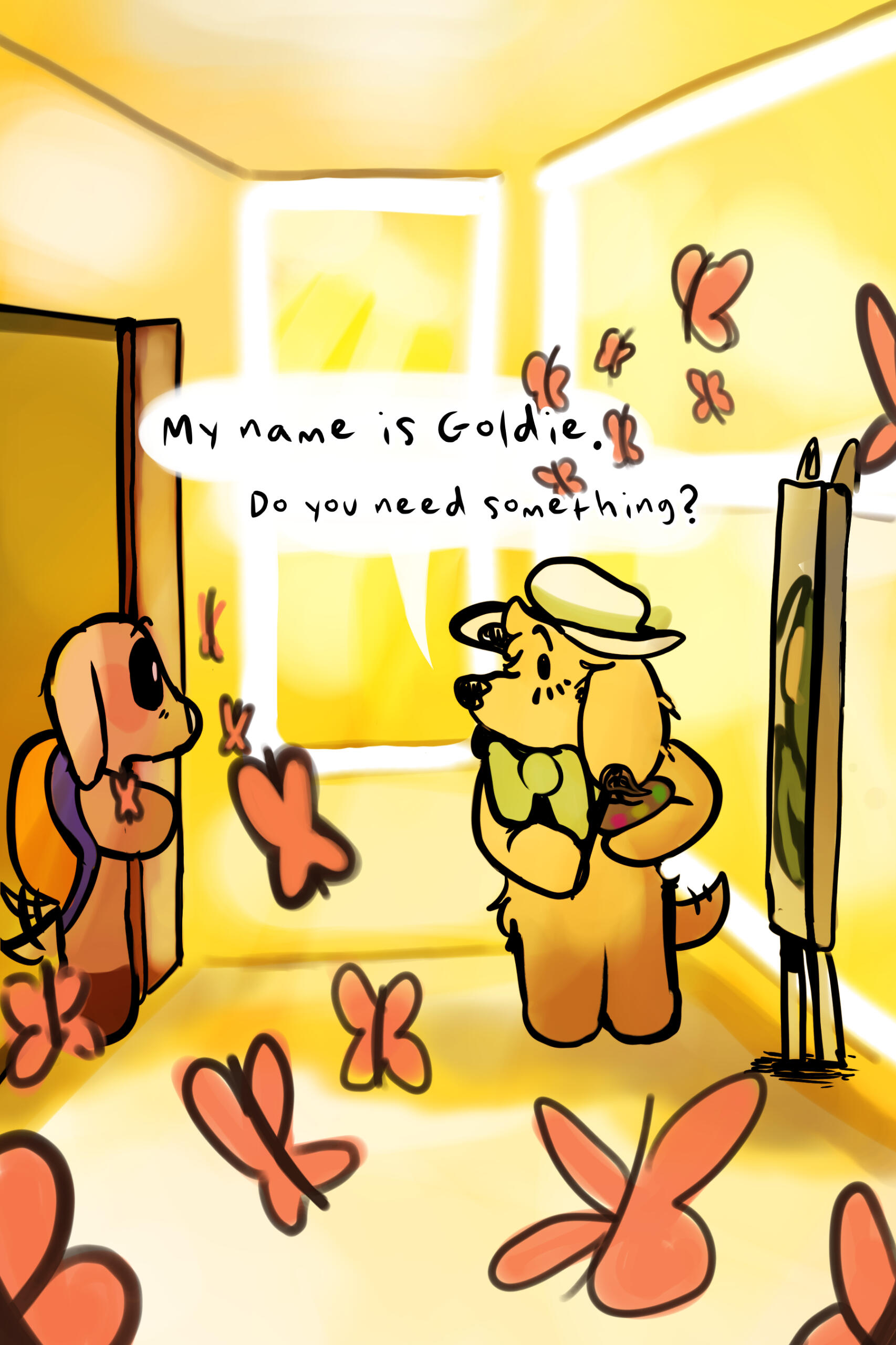 Goldie Brown is a current student at Ruban Academy at the time of Pupsy joining the school. She's on top of her schoolwork, yet seemingly distant from her homeroom class, Class 32A. Her favorite spot to do anything is the art classroom, what with it's beautiful windows near the top of the building. Her beautiful bow and hat can easily point her out of a crowd. Pupsy is enamored by this young pup, and will do anything to enrapture her.
